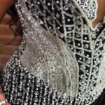 A breathtaking black and silver reception gown designed for a bold, unforgettable entrance. This figure-hugging dress features a structured, corset-style bodice adorned with intricate silver beadwork and embellishments that create a sculpted, hourglass silhouette.